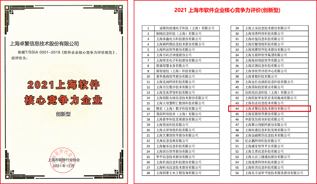 喜讯 | 卓繁信息荣获“2021上海市软件核心竞争力企业(创新型)”称号!