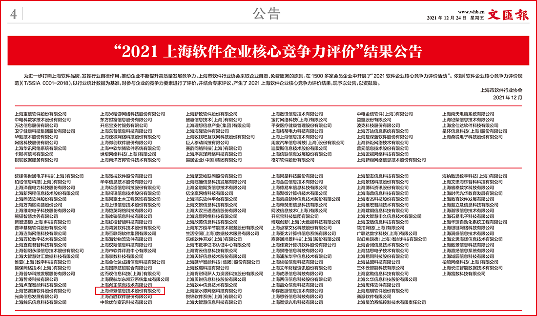 作为推动软件高质量发展的重要活动之一,本次评选依据《软件企业核心竞争力评价规范》(T/SSIA 0001-2018),以行业统计数据为基准,对参与企业的竞争力要素进行 了评价,并结合专家评议,产生了2021上海软件企业核心竞争力评价结果。相关荣誉结果在上海市软件行业协会官网发布,并刊登于《文汇报》。