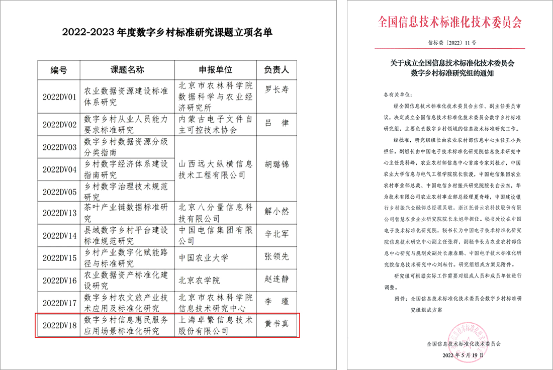 乡村信息惠民服务应用场景标准化研究》课题被采纳。前期由信标委牵头,卓繁信息参与的数字乡村评价指标体系的相关研究成果(服务和治理)已经提交至国标委。