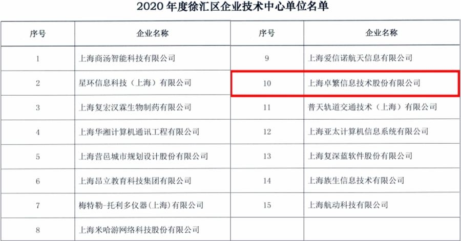 卓繁信息荣获2020年度徐汇区企业技术中心认定