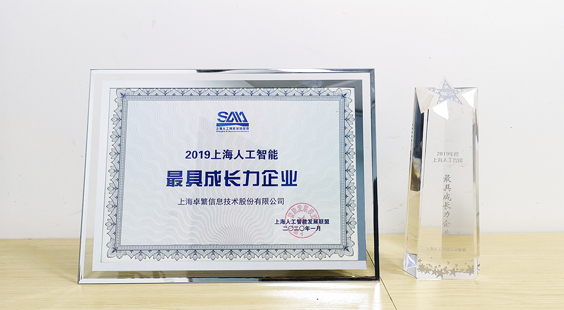 2020年1月3日,由上海人工智能发展联盟主办的“2020人工智能与长三角协同创新高峰论坛暨上海人工智能发展联盟年会”如期举行。卓繁信息获评“上海人工智能最具 成长力企业”。