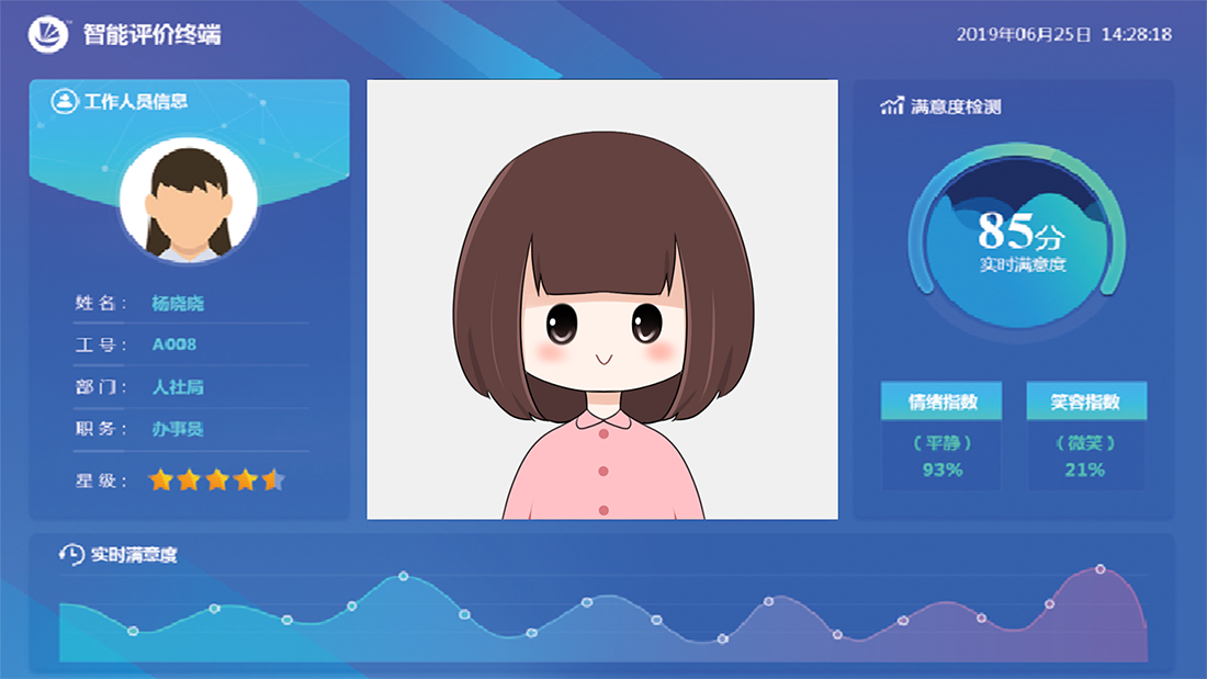 智能评价终端(设置于人工窗口侧),可通过对窗口办事群众脸部识别、情绪识别、语音识别等方式,实时采集人脸信息,动态显示评价分值(对窗口工作人员),从而客 观、真实的反应窗口服务的质量状况,倒逼窗口工作人员,改善服务态度,提高窗口服务水平。办事群众也可以切换至手动评价进行参与。