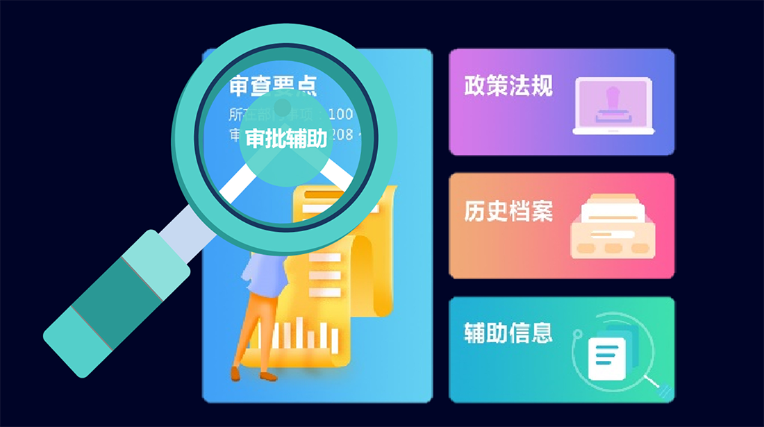 智能审批辅助终端(设置于后台审批侧),系统基于对受理信息的提取、分析,根据预置的审查标准规则,结合文档智能审阅技术对部门业务进行智能审核,并生成辅助审 批报告,辅助工作人员开展业务审核审批决策,加快审核速度,提高审核准确率与工作效率。