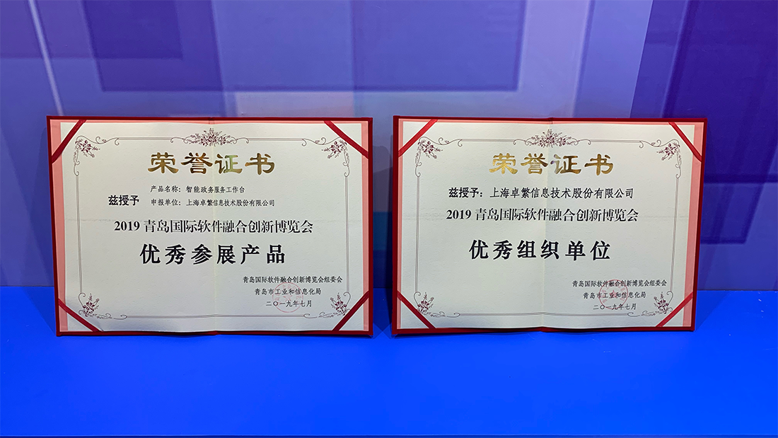更值一提的是,此次展会中,卓繁信息凭借卓越的产品技术和勇于创新的团队风貌,同时获得青岛国际软件融合创新博览会组委会颁发的“优秀参展产品”和“优秀组织单位”两项大奖。荣誉源自实力,荣誉的获得亦彰显了企业的业界影响力,卓繁信息感恩大家的肯定与信赖。